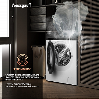 - Функция "Пар" - это инновационное решение от компании Weissgauff, которое позволит придать свежести вещам, а также устранить неприятный запах, легкие загрязнения и складки на одежде, бережно сохраняя при этом структуру волокон ткани. При выборе данной функции, пар добавляется ближе к середине цикла программы стирки белья, на этапах стирки и полоскания.