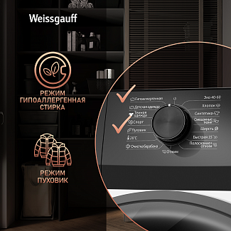- Глубина SuperSlim 38,5 см - мы в Weissgauff знаем, как важна в стиральной машине не только функциональность, но и компактность. Глубина этой модели позволит с легкостью разместить её даже в самой небольшой квартире!