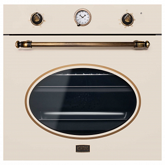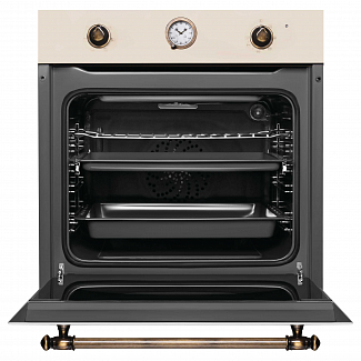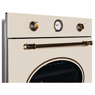Духовой шкаф, выполненный в классическом стиле, где поворотные регуляторы, ручка дверцы и другие элементы духового шкафа окрашены в бронзу, идеально сочетается с натуральными материалами и фурнитурой кухонной мебели в классическом или ретро стиле. Внешний вид часов, расположенных на панели управления, также выполнен в классическом стиле. Несмотря на их традиционный дизайн, внутри скрывается функциональность современного электронного таймера, который подаст акустический сигнал по истечению заданного времени.
