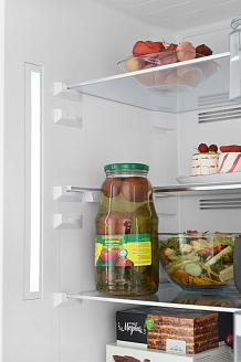 Зона свежести гарантирует, что пища внутри отделения остается свежей до 2-х раз дольше при идеальной температуре около 0 ºC. Разместите внутри замороженное мясо или рыбу для размораживания перед употреблением и убедитесь в отсутствии неприятного запаха и замечательного качества продуктов!Хромированная окантовка полочек