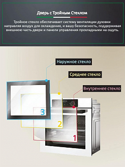 Специальные материалы стекла обладают свойствами защитного экрана, удерживающего тепло внутри камеры, а конструкция дверцы с применением трех стекол позволяет снизить температуру фронтальной поверхности до минимума. Все это снижает потребление электроэнергии и делает приготовление полностью безопасным.