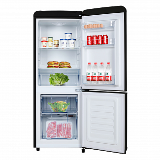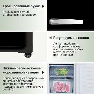 Несмотря на компактные габариты, ретро – холодильник оснащен полноценной морозильной камерой, в которой поддерживается температура до -18°С. Эргономичный дизайн внутреннего пространства помогает с комфортом расположить еду и напитки.