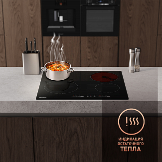 - Индикация остаточного тепла, сообщающая вам о том, когда прикасаться к конфорке уже безопасно, а когда - еще нет, ведь в течение некоторого времени после выключения, поверхность варочной панели все еще может оставаться горячей.