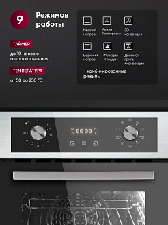 Девять режимов работы, включающие работу классических нагревательных элементов, кольцевого нагревателя в сочетании с конвектором, позволяют готовить самые сложные и необычные блюда.