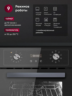 Девять режимов работы, включающие работу классических нагревательных элементов, кольцевого нагревателя в сочетании с конвектором, позволяют готовить самые сложные и необычные блюда.