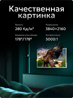 Модель с большой диагональю экрана 55 дюймов (139 см) станет прекрасным дополнением зала квартиры или дачи. Плоский smart TV можно повесить на стену в кухне с помощью кронштейна с универсальным креплением vesa 200x200. Разрешение Ultra HD в 4k с яркостью 280 Кд/м² и контрастностью 5000:1 обеспечивает четкое и насыщенное изображение, а широкий угол обзора позволяет наслаждаться просмотром с любого ракурса. Звуковой блок представлен 2 динамиками по 7 Вт с технологией Dolby Digital, которая гарантирует объемный и качественный звук без шумов.