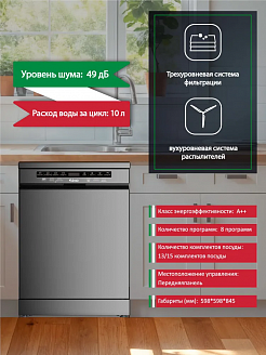 Эта посудомоечная машина оснащена трехуровневым фильтром, который эффективно улавливает остатки пищи, обеспечивая высокую гигиеничность и безопасность.Характеристики