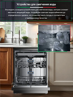 Эта модель оснащена устройством для смягчения воды, которое снижает жесткость входящей воды. Устройство смягчает водоснабжение до определенного уровня, что позволяет мыть посуду в соответствии с требованиями качества.Двухуровневая система распылителей