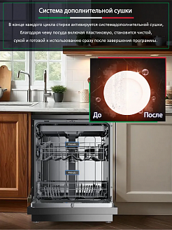 В конце каждого цикла стирки активируется система дополнительной сушки, благодаря чему посуда включая пластиковую, становится чистой, сухой и готовой к использованию сразу после завершения программы.Уход за стеклом