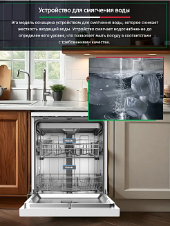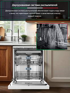 Эта модель оснащена устройством для смягчения воды, которое снижает жесткость входящей воды. Устройство смягчает водоснабжение до определенного уровня, что позволяет мыть посуду в соответствии с требованиями качества.Двухуровневая система распылителей