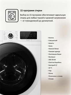 Программы стирки: Быстрая стирка, Стирка изделий из шерсти, Стирка пуховых вещей, Стирка смешанных тканей, Дополнительное полоскание, Стирка изделий из хлопка, Настраиваемый режим стирки, Экономичная стирка, Стирка изделий из шелка, Удаление пятен, Отжим, Полоскание + отжим, Интенсивная стирка, Высокотемпературная стирка, Стирка нижнего белья