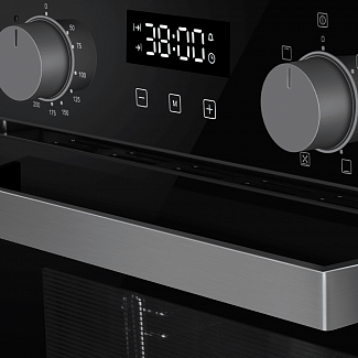Комбинированное управление реализовано с помощью сенсорного дисплея и цельнометаллических ручек PUSH PULL. Можно установить таймер, выбрать температуру (50°-250°C) и один из 7-ми режимов работы: внутреннее освещение, традиционный нагрев, большой гриль, конвекция с нижним нагревом, нижний нагрев, конвекционный нагрев, малый гриль.