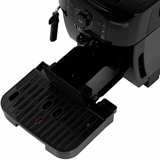 - Удобство использования. Диспенсер регулируется по высоте – удобно использовать и миниатюрные чашечки-эспрессо, и бокалы для латте. Капли собираются в поддоне, который легко вынимается для очистки. Уход за кофемашиной облегчают съёмный заварочный блок и цикл автоматической очистки от накипи. Решётку для капель и поддон можно мыть в посудомоечной машине, что упрощает уход.