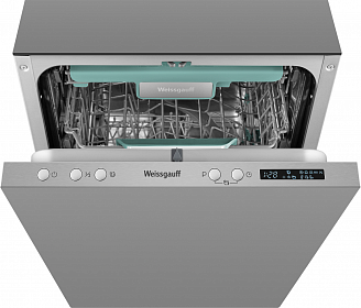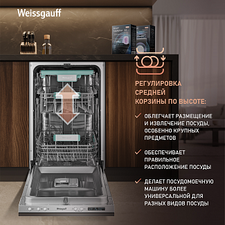 - До 10 комплектов посуды одновременно вы можете расположить в данной посудомоечной машине, благодаря современным продуманным и эргономичным корзинам, которыми Weissgauff оснастили эту модель