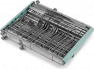- Три корзины, позволяющие разместить отдельно от остальной посуды в верхнем лотке сразу все ложки, вилки и ножи, обеспечивая при этом их наилучшее мытьё.