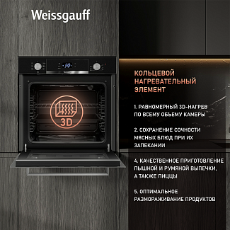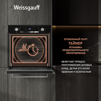 - Великолепный дизайн, станет финальным штрихом в совершенстве облика этой модели. Каждый раз, взаимодействуя с духовым шкафом от Weissgauff, вы будете в полной мере ощущать, как он способен нагревать не только еду, но и согревать душу, став настоящим сердцем вашего уютного домашнего очага.