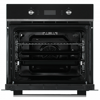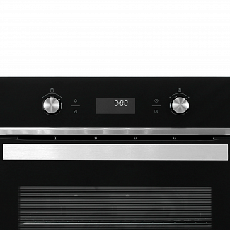 На стеклянной дверце расположена панель управления с утапливаемыми поворотными переключателями, сенсорными кнопками и дисплеем. Таймер с автоотключением программирует необходимое время работы духового шкафа. Телескопические направляющие благодаря выдвижной конструкции упрощают установку противней и решеток. Для освещения камеры и контроля степени готовности блюд установлена галогенная лампа. Покрытие внутренних стенок духового шкафа DEXP 1MD-B из эмалированной стали устойчиво к повреждениям и просто очищается от загрязнений.