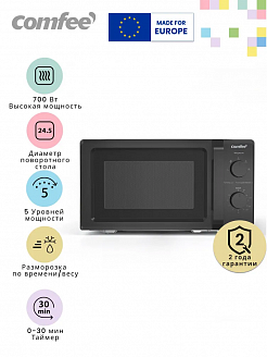 Корпус микроволновой печи выполнен в лаконичном черном цвете, который впишется в любой интерьер кухни.Выбирая микроволновую печь Comfee CMW719L2W-B, вы получаете надежное и функциональное устройство, которое поможет вам быстро и вкусно приготовить разнообразные блюда.