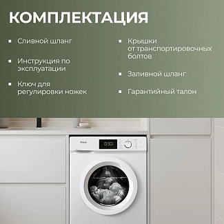 Комплектация: Инструкция по эксплуатации, сливной шланг, заливной шланг, ключ для регулировки ножек стиральной машины, крышки от транспортировочных болтов, гарантийный талон.