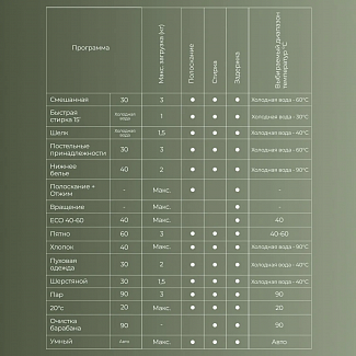 Программы стирки: Быстрая стирка, Стирка изделий из шерсти, Стирка пуховых вещей, Дополнительное полоскание, Стирка изделий из хлопка, Экономичная стирка, Стирка изделий из шелка, Удаление пятен, Полоскание + отжим, Цветное белье, Стирка одеял, Стирка нижнего белья