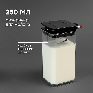 Комплектация: Кофемашина, резервуар для молока, шланг для молока, щеточка для чистки, инструкция, гарантийный талон
