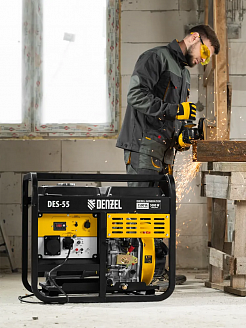 Генератор дизельный Denzel DES-55 94413 с объемом топливного бака 11 л, с ручным стартером, имеет максимальную выходную мощность 5,5 кВт и поддерживает напряжение в сети 230 В.Используется для снабжения энергией потребителей однофазного тока (осветительных приборов, бытовой техники, электроинструмента) при отсутствии доступа к стационарному источнику питания.