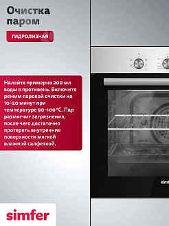 Данный метод очистки позволяет удалять жировые отложения, не используя при этом сильные химические вещества, которые могут повредить внутреннюю поверхность духовки. Устанавливаете режим, наливаете воду, которая медленно испаряясь, смягчает загрязнение и после протираете мягкой тряпкой.