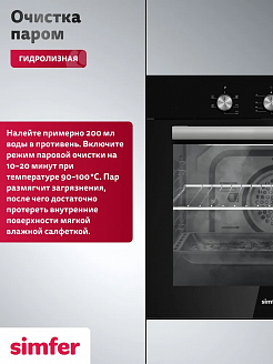 Данный метод очистки позволяет удалять жировые отложения, не используя при этом сильные химические вещества, которые могут повредить внутреннюю поверхность духовки. Устанавливаете режим, наливаете воду, которая медленно испаряясь, смягчает загрязнение и после протираете мягкой тряпкой.