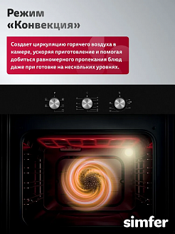 Конвекционный вентилятор обеспечивает постоянную циркуляцию горячего воздуха по всей камере, что позволяет равномерно запекать блюдо со всех сторон, а также экономить время на приготовление. Режим конвекции особенно оценят любители приготовления выпечки.