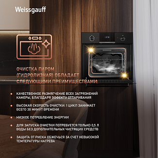 - Гидролизная очистка - особая технология, благодаря который вы раз и навсегда забудете те дни, когда духовой шкаф необходимо было с большим трудом вычищать, вкладывая в это непозволительно много времени и сил. Weissgauff понимает, что в современном мире время является одной из наивысших ценностей - поэтому мы оснастили данную модель функцией гидролиза: всего лишь добавьте небольшое количество воды, и духовой шкаф сам отпарит все загрязнения, используя "эффект сауны", после чего вам останется лишь провести по стенкам мягкой губкой, собрав их и удалив одним движением.