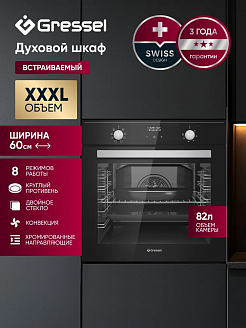 Встраиваемый электрический духовой шкаф Gressel 60 см, объём 82 л, идеально подходит для дома и кухни. 8 режимов работы: конвекция, верхний и нижний нагрев, комбинированные режимы — обеспечивают равномерное запекание, выпечку и приготовление мясных и овощных блюд. Оснащён цифровым таймером и дисплеем, хромированными направляющими, дверцей с двойным и съёмным стеклом, внутренним освещением. Чёрный металлический корпус выглядит стильно и легко чистится. В комплекте — решётка, прямой противень и круглый противень. Общая мощность 2400 Вт. Отличный выбор среди встраиваемых духовок Gressel, сочетание конвекции и вентилятора для быстрых и равномерных результатов.Характеристики