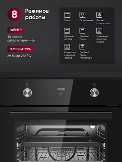 Восемь режимов работы, включающие работу классических нагревательных элементов, кольцевого нагревателя в сочетании с конвектором, позволяют готовить самые сложные и необычные блюда.