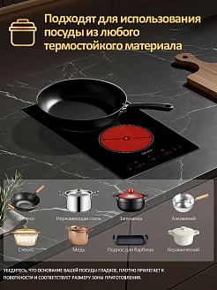 - Легкость в уходе: Стеклокерамическая поверхность устойчива к загрязнениям и легка в уходе, вам не придется тратить много времени на уборку.