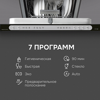 Программы ECO (50°С, 198 мин), Быстрая (45°С, 30 мин), Стекло (45°С, 120 мин), 90 минут (55°С, 90 мин), Предварительное полоскание (15 мин), Auto (65°С, 150 мин), Гигиеническая (72°С, 195 мин)