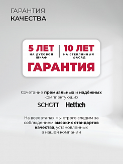Гарантия: 5 лет гарантия на духовой шкаф и 10 лет гарантия на стеклянный фасад