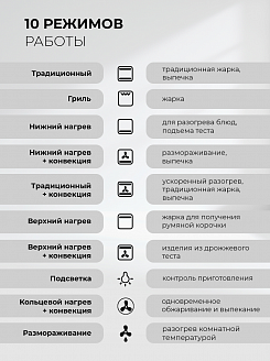 Режимы работы: Верхний нагрев, верхний нагрев с конвекцией, гриль, нижний нагрев, нижний нагрев с конвекцией, подсветка, размораживание, традиционный, кольцевой нагрев с конвекцией, традиционный нагрев + конвекция