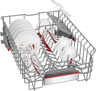 Система регулировки по высоте Rackmatic поможет оптимизировать пространство посудомоечной машины под ваши индивидуальные потребности. Даже полностью загруженный верхний короб можно с легкостью переставлять по высоте на 3-х уровнях шагом до 5 см, нажав на рычажки, расположенные по бокам короба.