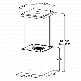 Дополнительные особенности: Крепление к потолку подвесными тросами (макс высота с учетом тела вытяжки– 1850 мм)