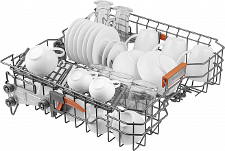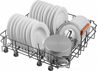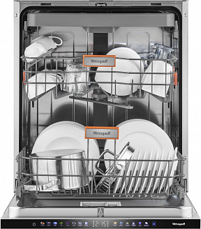 - До 15 комплектов посуды одновременно вы можете расположить в данной посудомоечной машине, благодаря современным продуманным и эргономичный корзинам, которыми Weissgauff оснастили эту модель