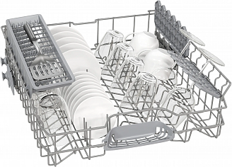Система регулировки по высоте Rackmatic поможет оптимизировать пространство посудомоечной машины под ваши индивидуальные потребности. Даже полностью загруженный верхний короб можно с легкостью переставлять по высоте на 3-х уровнях шагом до 5 см, нажав на рычажки, расположенные по бокам короба.
