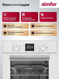 1 стандартный и круглый противни, хромированная решетка, дополнительная хромированная решётка, инструкция по применению, гарантийный талон, сертификатХарактеристики