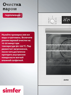Данный метод очистки позволяет удалять жировые отложения, не используя при этом сильные химические вещества, которые могут повредить внутреннюю поверхность духовки. Устанавливаете режим, наливаете воду, которая медленно испаряясь, смягчает загрязнение и после протираете мягкой тряпкой.