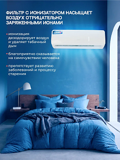 Укомплектован фильтром с ионизатором, который насыщает воздух отрицательно заряженными ионами. Известно, что ионизированный воздух благоприятно сказывается на самочувствии человека, препятствует развитию заболеваний и процессу старения. Ионизация дезодорирует воздух и удаляет табачный дым.