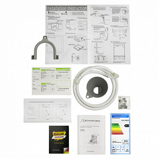 В комплекте: Лоток для столовых приборов, Сливной шланг, Пластиковый держатель для сливного шланга, Воронка для засыпки соли, Руководство по эксплуатации, Гарантийный талон