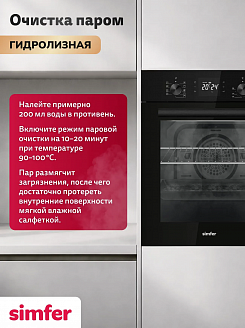Данный метод очистки позволяет удалять жировые отложения, не используя при этом сильные химические вещества, которые могут повредить внутреннюю поверхность духовки. Устанавливаете режим, наливаете воду, которая медленно испаряясь, смягчает загрязнение и после протираете мягкой тряпкой.