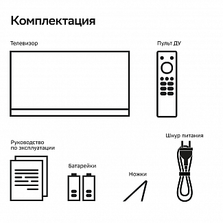 Комплектация: Умный телевизор Sber, Батарейки 2 × AAA, Пульт, Инструкции, Ножки