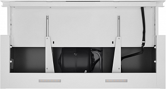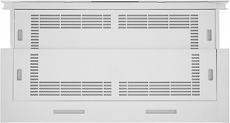- Фасад выдвижной панели выполнен из закаленного глянцевого стекла белого цвета. Основная рабочая и выдвижная панель изготовлены из нержавеющей стали с эмалированным белым покрытием. Откидные панели на них, также белого цвета, сделаны с вентиляционными прорезями и скрывают за собой 2 легко вынимаемых многослойных алюминиевых жироулавливающих фильтра. Корпус сделан из нержавеющей стали.